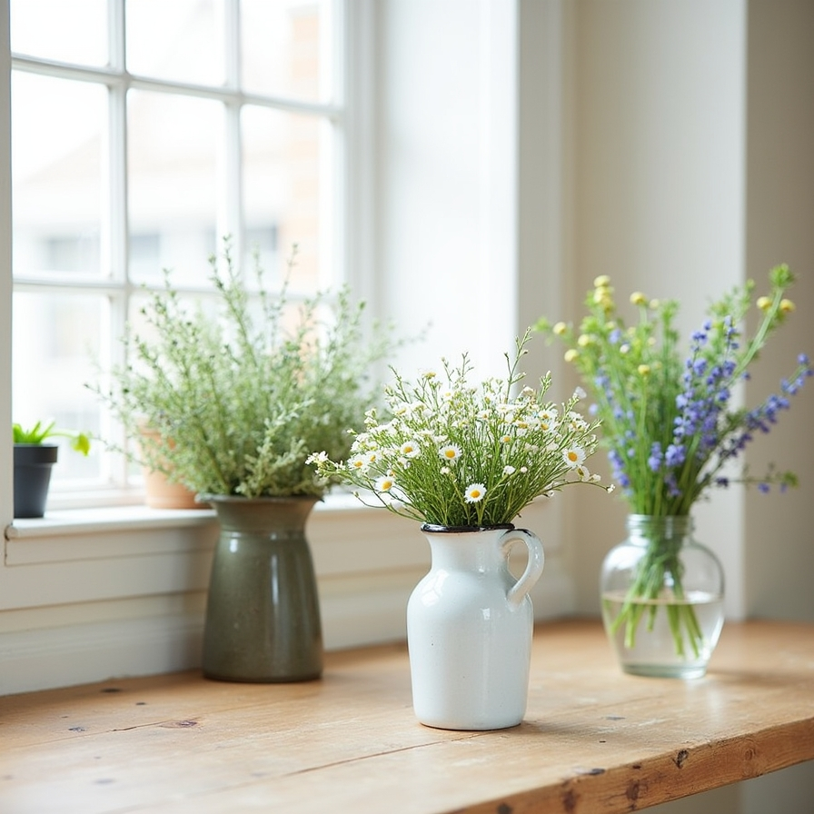 Fresh plants and flowers are an easy way to add life and color to any room. Cottage-inspired interiors often feature simple arrangements that feel natural rather than overly styled. A small bundle of wildflowers placed in a ceramic jug or glass jar can instantly brighten a kitchen table or windowsill.