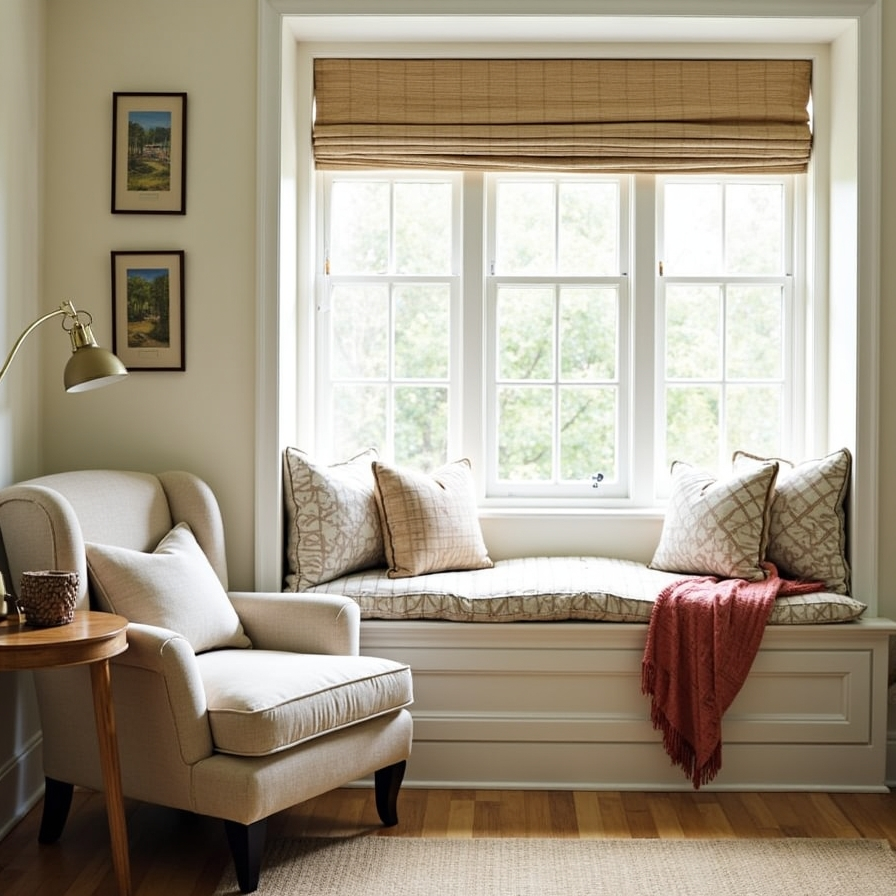 Even without built-in seating, you can recreate the same feeling. A cushioned armchair placed near a window works perfectly. Add a plaid blanket, a small side table, and a soft lamp for evening reading. The goal is to create a peaceful spot that encourages quiet moments.