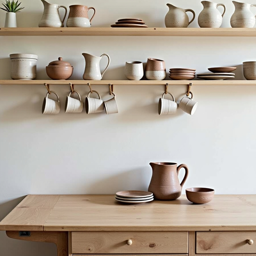 Displaying these items on shelves or countertops can add visual warmth to a room. A collection of mugs hanging on hooks or a row of ceramic bowls stacked neatly together creates a charming and practical display. These pieces often feature earthy colors that blend naturally with wooden furniture and neutral walls.