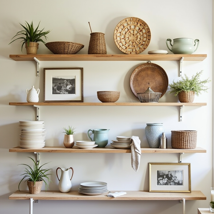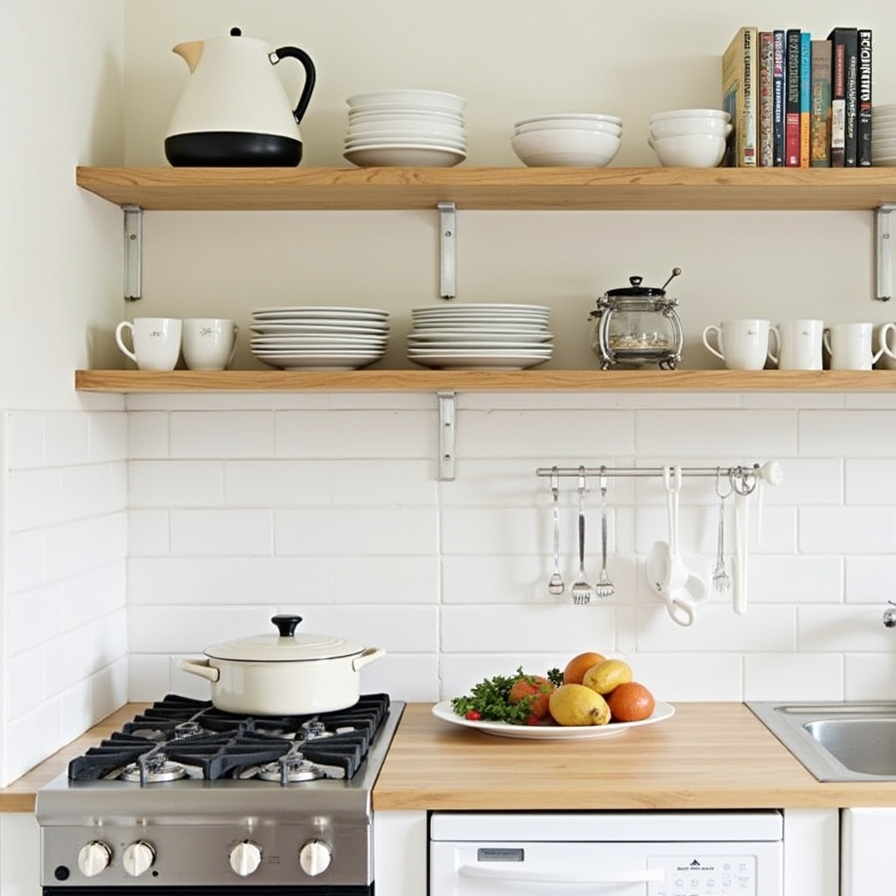 Neatly arranged plates, cups, and cookbooks can become part of the room’s design. The key is to keep the shelves tidy and balanced so they feel calm rather than cluttered. Mixing useful kitchen tools with small decorative pieces keeps the display functional yet attractive.