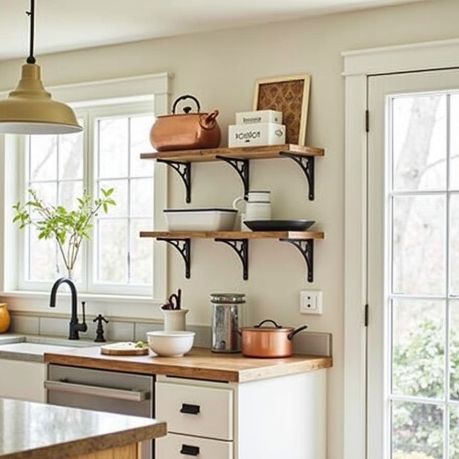 Copper cookware displayed on hooks or shelves also creates a warm and inviting look. Over time, copper develops a natural patina that adds to its charm and authenticity. These materials are not only durable but also visually striking against light walls and wooden surfaces.
