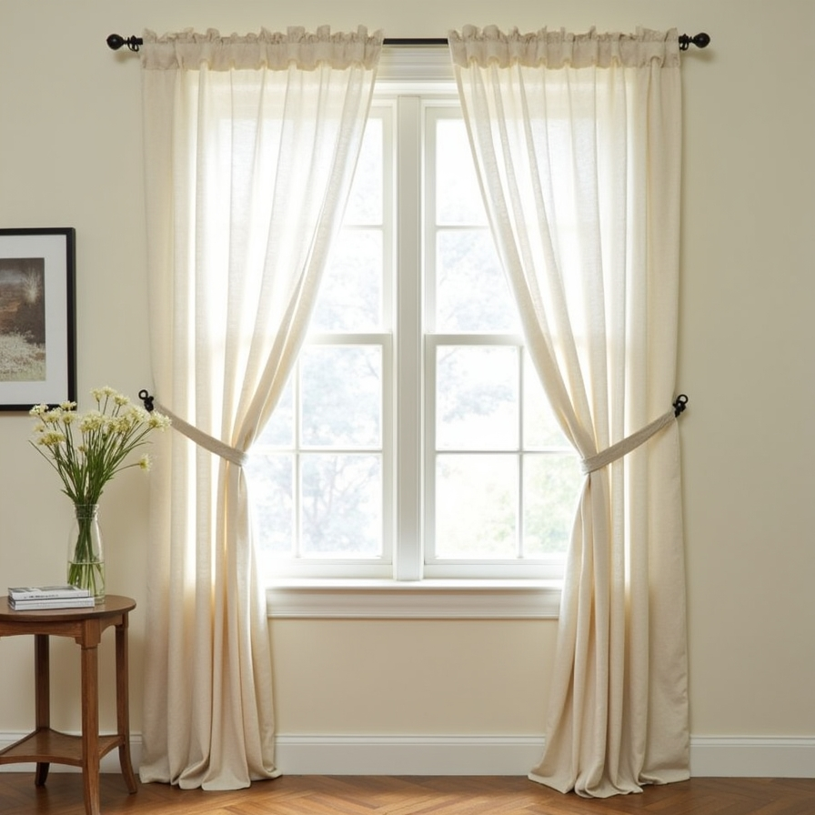 If lace does not match your style, linen or cotton curtains work just as well. Neutral shades like cream, soft white, or light beige keep the room feeling bright and open. These fabrics provide privacy while still letting natural light fill the space.