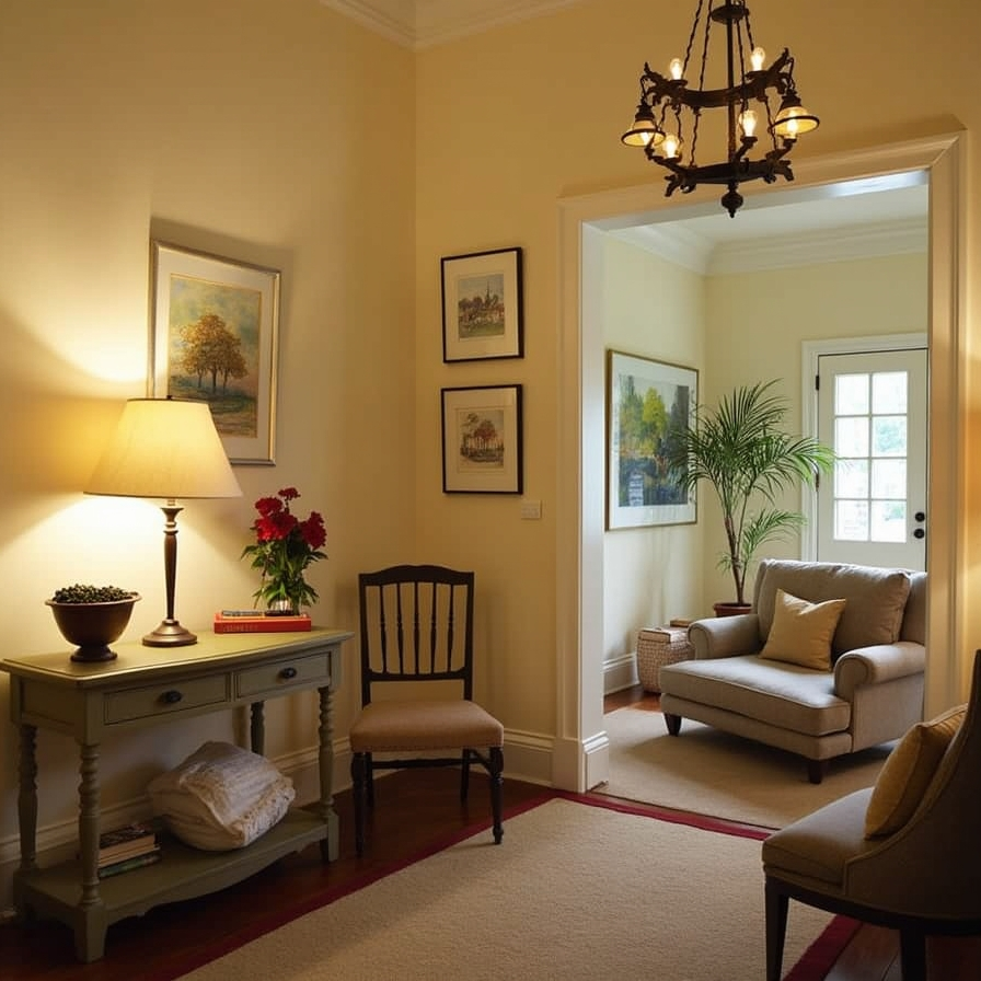 Table lamps with fabric shades are especially effective for evening lighting. They diffuse light softly across the room, creating a relaxing atmosphere perfect for reading or conversation. Hanging fixtures made from iron or aged metal can add a touch of vintage character while still providing practical lighting.