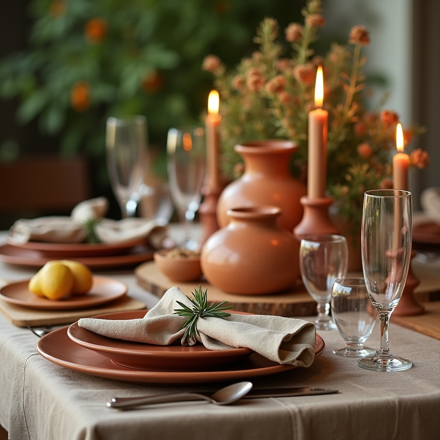 Under soft candlelight, terracotta elements bring a warm, rustic appeal to any Italian-inspired table. Combine terracotta plates with wooden serving boards to create an earthy, organic look that feels inviting and grounded. Layer a linen tablecloth in muted shades like beige or soft taupe to enhance the cozy ambiance. Fresh herbs, such as rosemary tied around napkins, add a fragrant and visual touch reminiscent of Italian gardens. This combination evokes the charm of a sun-drenched Tuscan villa, making it perfect for intimate dinners or relaxed gatherings with friends and family.