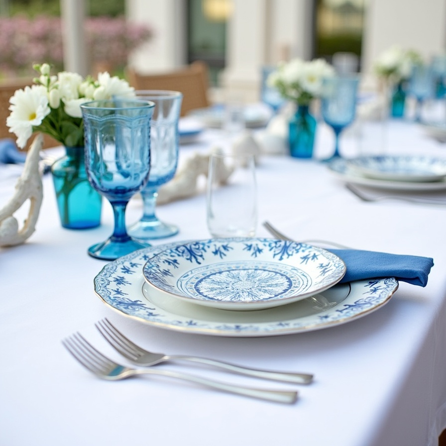 Blue and white table settings capture the serene beauty of Italy’s Amalfi Coast. Hand-painted ceramic plates with intricate patterns can be paired with crisp white linens for a timeless, elegant look. Enhance the coastal vibe with glassware in ocean tones and seashell or driftwood centerpieces that reflect the seaside environment. Olive branches or small potted greenery add natural contrast and freshness. Ideal for summer events, this tablescape creates a light, airy atmosphere that embodies the tranquility and elegance of Italian coastal living, making each meal feel like a seaside escape.