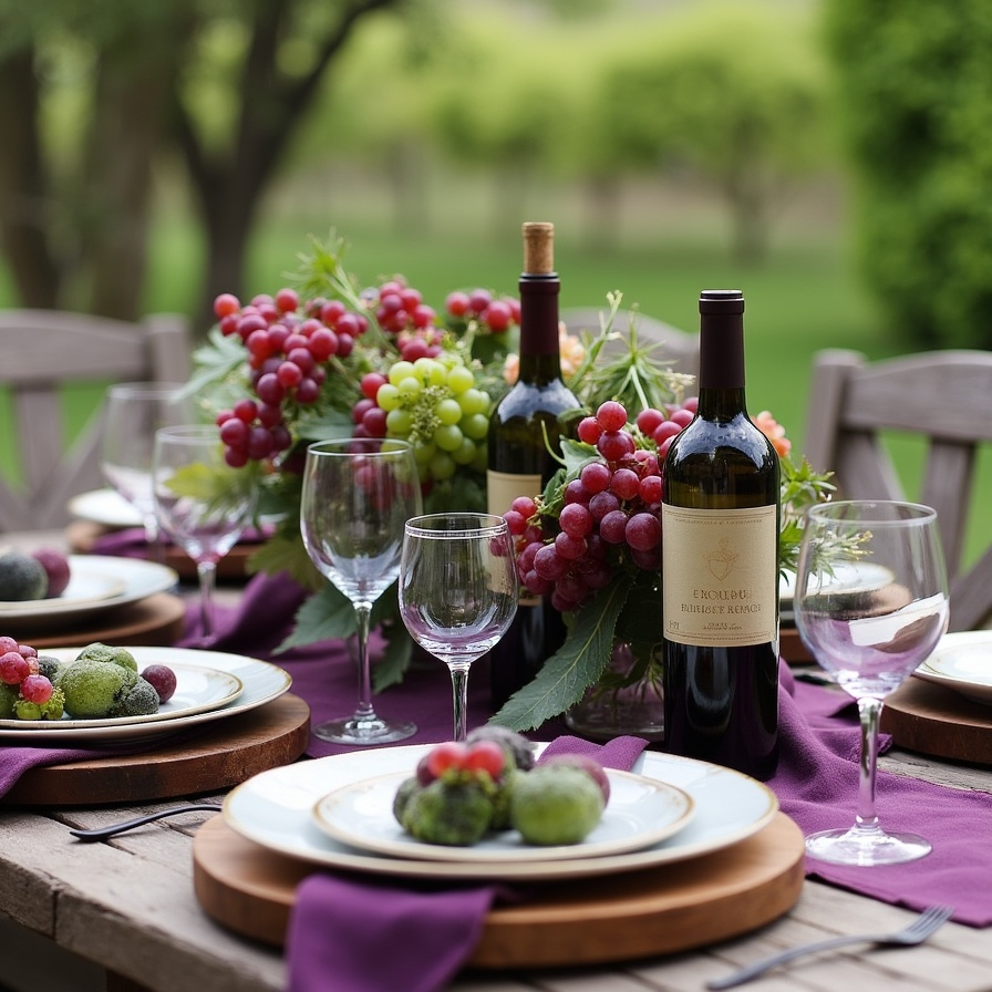 Bring the romance of Italian vineyards to your outdoor dining space by incorporating grapevine-inspired elements. Deep purple and green tones in napkins, floral arrangements, or table accessories evoke the lush beauty of vineyard landscapes. Wine bottles can serve as part of the centerpiece, surrounded by clusters of fresh grapes for a visual and thematic touch. Wooden boards and rustic ceramic plates add texture and authenticity. This alfresco tablescape encourages leisurely meals paired with fine wine, creating an inviting, rustic atmosphere that combines culinary delight with natural elegance.