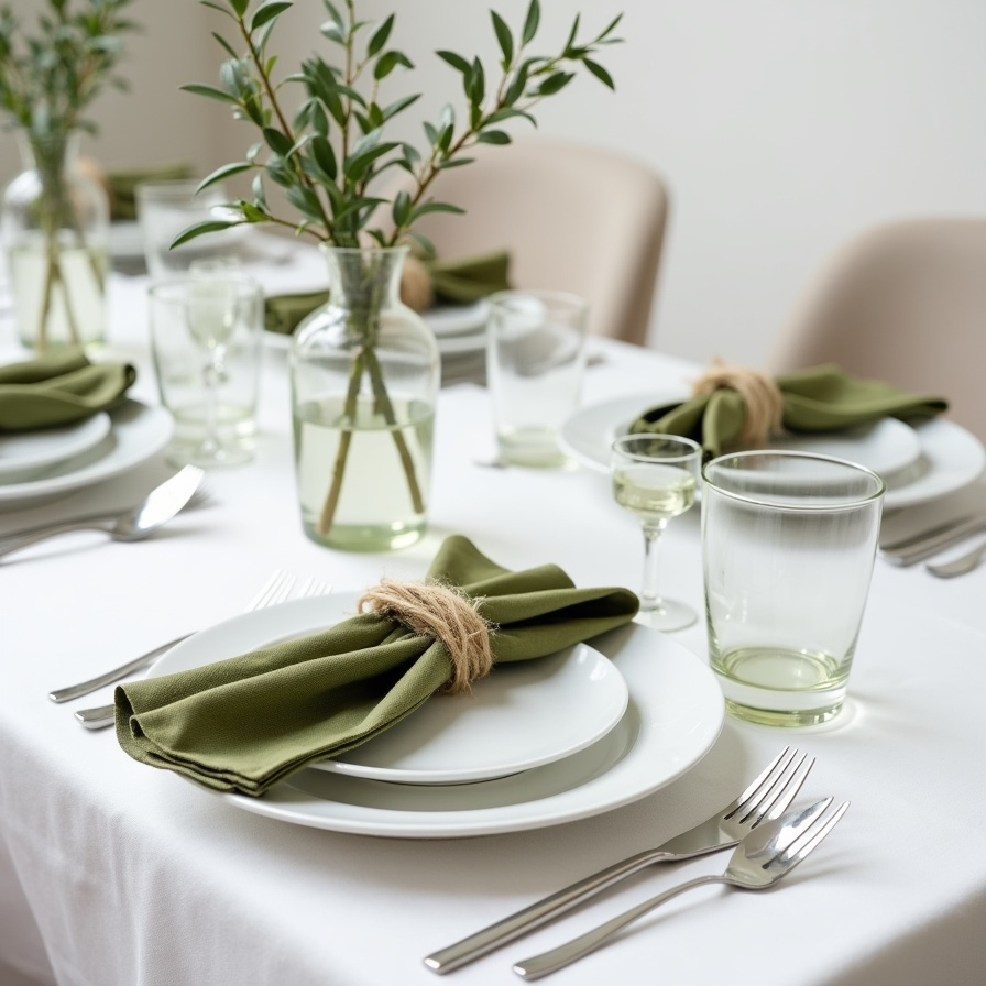A minimalist approach using white and olive-green tones brings understated sophistication to any Italian tablescape. Begin with a crisp white tablecloth as a neutral foundation, and incorporate simple centerpieces like olive branches in clear glass vases for a natural, timeless look. White porcelain dishes paired with olive-green napkins tied with raffia enhance the minimalist aesthetic. This versatile design works for casual lunches or formal dinners, emphasizing simplicity, elegance, and natural beauty. Its clean lines and muted colors allow the focus to remain on the meal and the overall dining experience.