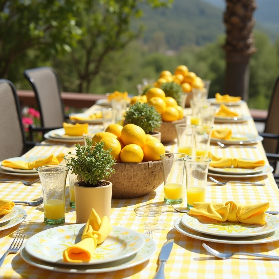 Bring the sunny, vibrant energy of Capri to your table with a lemon-themed setting. Fresh lemons arranged in rustic baskets or scattered along the table provide natural color and fragrance. Lemon-patterned plates and bright yellow napkins enhance the cheerful, summery feel, while small potted lemon trees or lemon-scented candles add charm and sophistication. Perfect for outdoor gatherings, this tablescape radiates energy and freshness. The combination of vibrant hues, citrus aromas, and playful design elements makes this setting both visually appealing and inviting for guests of all ages.