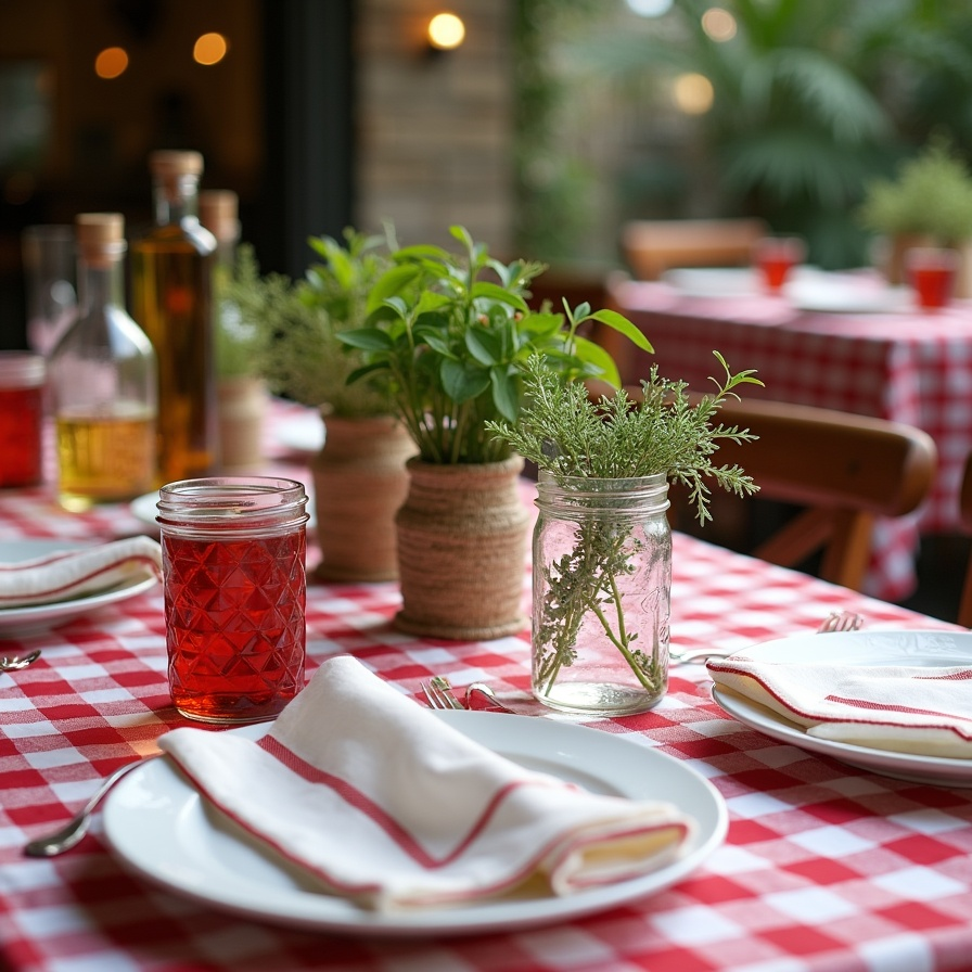 Capture the nostalgic charm of an Italian trattoria with a red-and-white checkered tablescape. Simple white plates and mason jars for drinks maintain an authentic yet approachable feel. Add small pots of fresh basil or oregano as both centerpieces and practical culinary accents. Rustic bread baskets and bottles of olive oil on the table enhance the traditional ambiance. This timeless design exudes warmth, comfort, and casual elegance, perfect for family dinners or casual get-togethers. The cheerful, familiar pattern evokes classic Italian hospitality, making every meal feel welcoming and homey.
