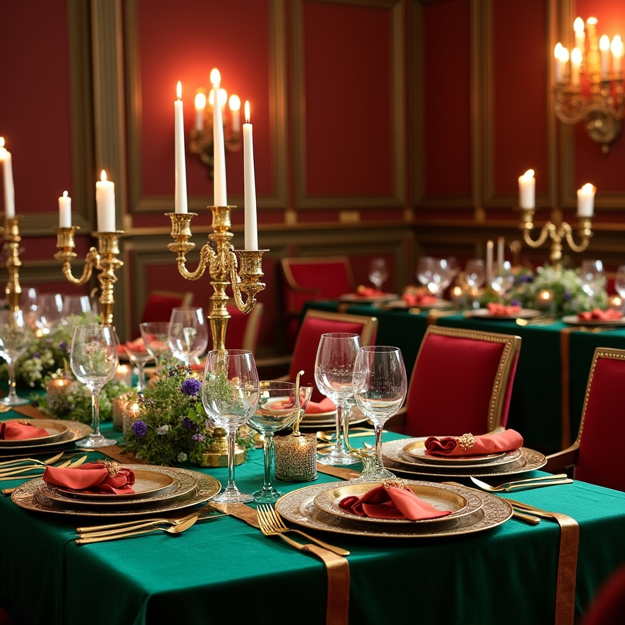 Embrace the grandeur of Venice with a tablescape rich in gold accents and deep jewel tones. Choose luxurious tablecloths in shades like emerald green or deep red, complemented by gold-rimmed plates and cutlery for an opulent effect. Ornate glassware inspired by Murano designs and dramatic candelabras elevate the aesthetic for formal occasions. This setting conveys sophistication and extravagance, perfect for upscale dinners, gala events, or celebratory feasts. Combining elegance with intricate detailing, the tablescape reflects Italian luxury and craftsmanship while creating a memorable dining experience for guests.