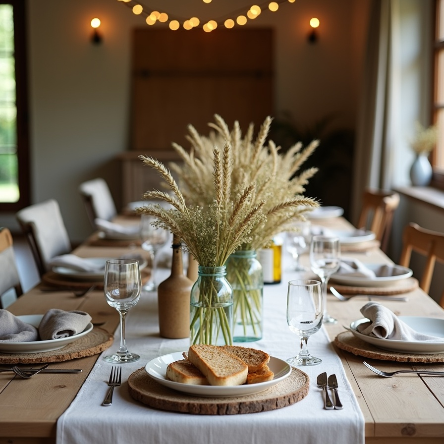 A farmhouse-inspired Italian tablescape offers rustic charm and casual comfort for any gathering. Use natural wooden elements such as chargers, boards, or tables, paired with crisp linens in neutral shades like beige, gray, or soft white. Mason jars filled with wildflowers or wheat stalks create simple yet captivating centerpieces. Incorporate baskets of fresh bread and olive oil to enhance the inviting, homely atmosphere. String lights overhead or candles on the table further contribute to the cozy ambiance. This style combines practicality with beauty, evoking the warmth of a countryside Italian home.