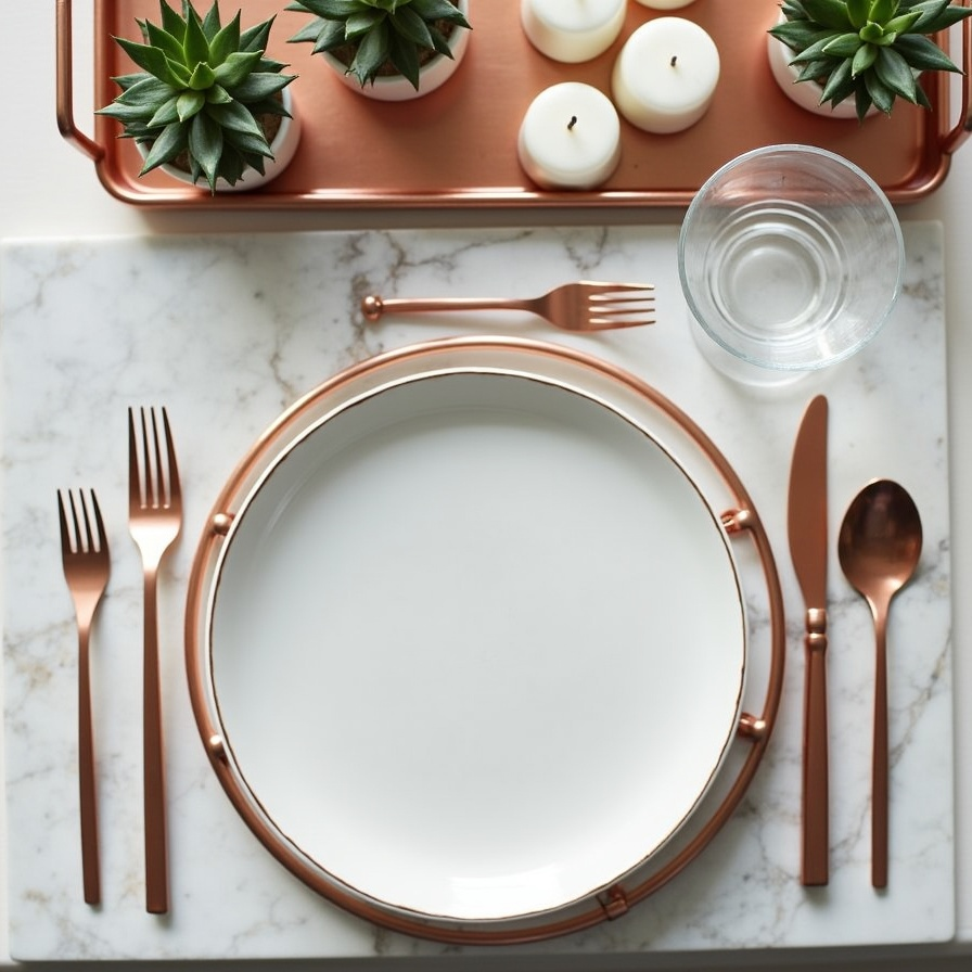 Combine modern urban style with Italian elegance by using copper and marble accents. Marble-look placemats, chargers, or serving trays paired with copper utensils provide a sleek, sophisticated contrast. Geometric candle holders or small succulents add minimalist charm without overpowering the table. Neutral linens or muted tones can soften the design while maintaining contemporary appeal. This industrial-chic approach suits modern homes or event spaces, offering a refined, upscale aesthetic. Its balance of natural and industrial materials makes it a versatile choice for both casual gatherings and stylish dinner parties.