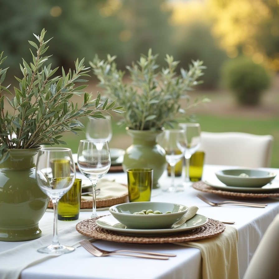 Recreate the tranquility of an Italian olive grove with a green-and-cream color palette. Use creamy table linens as a soft backdrop, paired with olive-green plates or glassware. Centerpieces of olive branches in ceramic pitchers evoke natural beauty and simplicity, while small bowls of olives add thematic detail and functionality. This tablescape emphasizes calm, understated elegance, reflecting the peaceful ambiance of Italy’s countryside. Its natural, muted tones make it ideal for relaxed meals or intimate gatherings where comfort and aesthetic harmony are equally important.