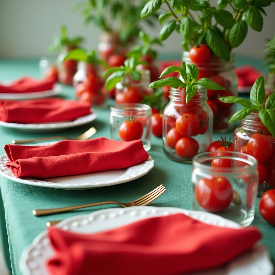 Inspired by the colors of Italy’s classic Caprese salad, a tomato-and-basil-themed tablescape is lively and refreshing. Combine red and green napkins with white plates for a vibrant yet balanced look. Centerpieces made of cherry tomatoes and basil sprigs in glass jars add freshness and visual interest. Perfect for casual gatherings, this theme celebrates Italian cuisine while providing a playful, colorful atmosphere. The combination of bold hues and natural elements ensures that your table feels inviting, joyful, and authentically Italian, reflecting the country’s love for food, color, and conviviality.