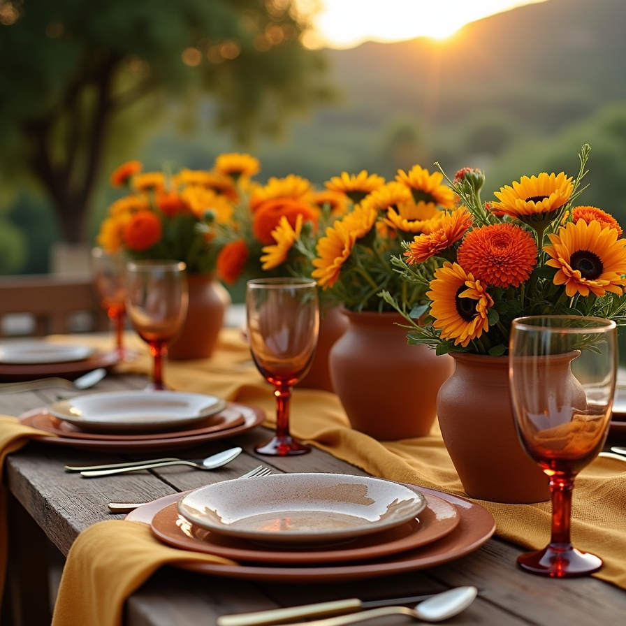Capture the essence of a Tuscan sunset with warm, earthy tones such as burnt orange, terracotta, and mustard yellow. Use terracotta pots filled with sunflowers or marigolds as centerpieces to create a natural focal point. Textured table linens and bronze or gold-toned flatware complement the warmth of the color palette. This cozy and inviting design is ideal for autumn gatherings or evening dinners. By evoking the tranquil beauty of the Italian countryside, the setting fosters a sense of comfort, nostalgia, and relaxed elegance, perfect for enjoying a leisurely meal with loved ones.
