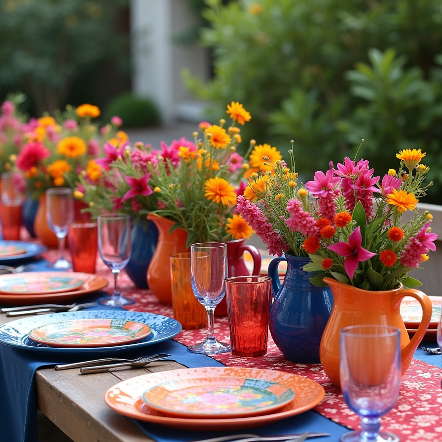 Celebrate the vibrant spirit of the Mediterranean with a colorful Italian tablescape. Rich hues like cobalt blue, orange, and fuchsia set an energetic tone, complemented by patterned table runners and bold dishware. Incorporate bright floral arrangements and ceramic pitchers for drinks, adding both practicality and flair. This festive setting is perfect for large gatherings, family feasts, or celebratory events, creating an atmosphere full of joy and energy. By embracing bold, vivid colors and natural elements, the tablescape captures the essence of a lively Italian summer feast, making every meal feel like a special occasion.