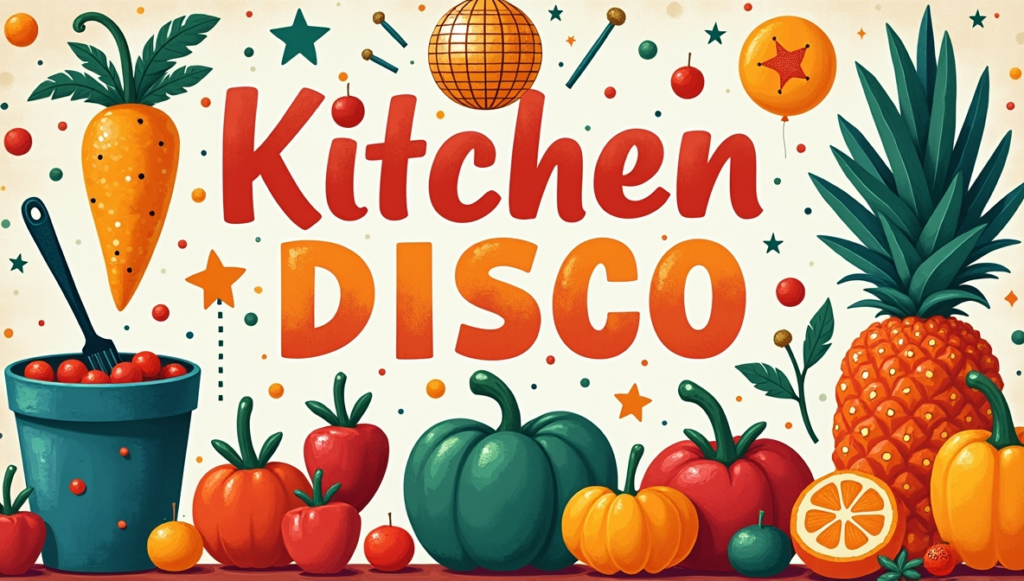The print features bright fruits, vegetables, and dynamic graphics that evoke a sense of movement and celebration. A central disco ball motif adds a festive touch, making it clear that this kitchen embraces both creativity and entertainment. Bold, eye-catching fonts further amplify the lively, upbeat mood of the room.