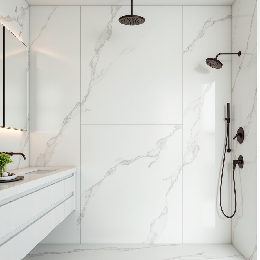 This shower design commands attention. A single, large porcelain slab covers the entire shower wall, giving the illusion of a seamless marble surface without the upkeep. Minimal grout lines make the walls appear smooth and modern, while a rainfall showerhead elevates the experience into a true luxury retreat. It’s an ideal choice for homeowners who want the elegance of marble without worrying about sealing or high maintenance. The clean, uninterrupted panels make small bathrooms feel larger and create a striking focal point that blends style with practicality.