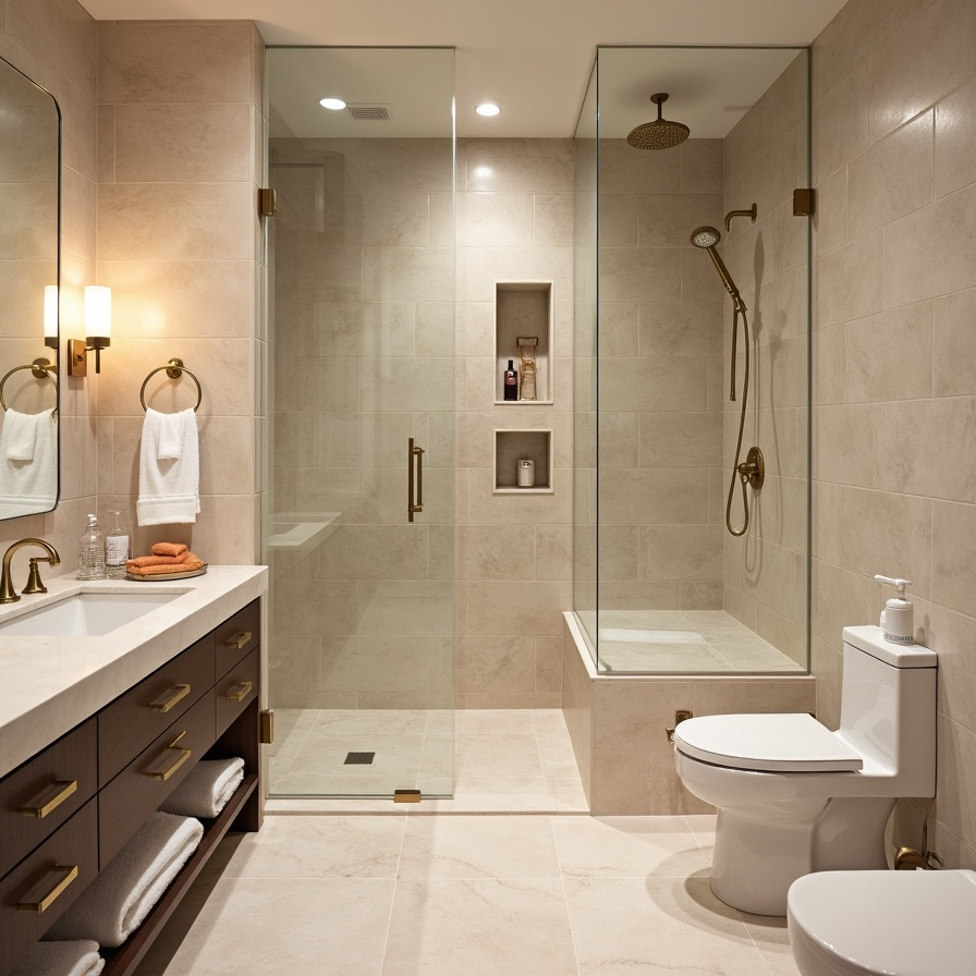 Beige tiles create warmth and softness while maintaining a polished, seamless appearance. Integrated niches keep surfaces functional and clean. Natural light enhances texture and vibrancy, ensuring the space feels fresh. This style provides a timeless balance between comfort and elegance, suitable for everyday family use while remaining sophisticated.
