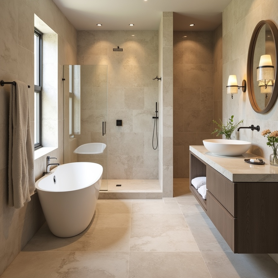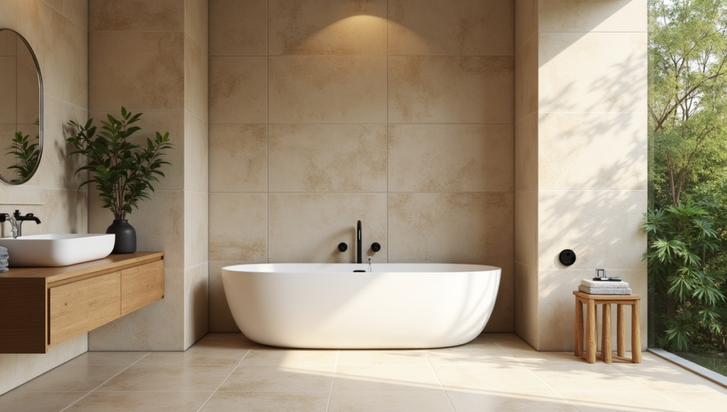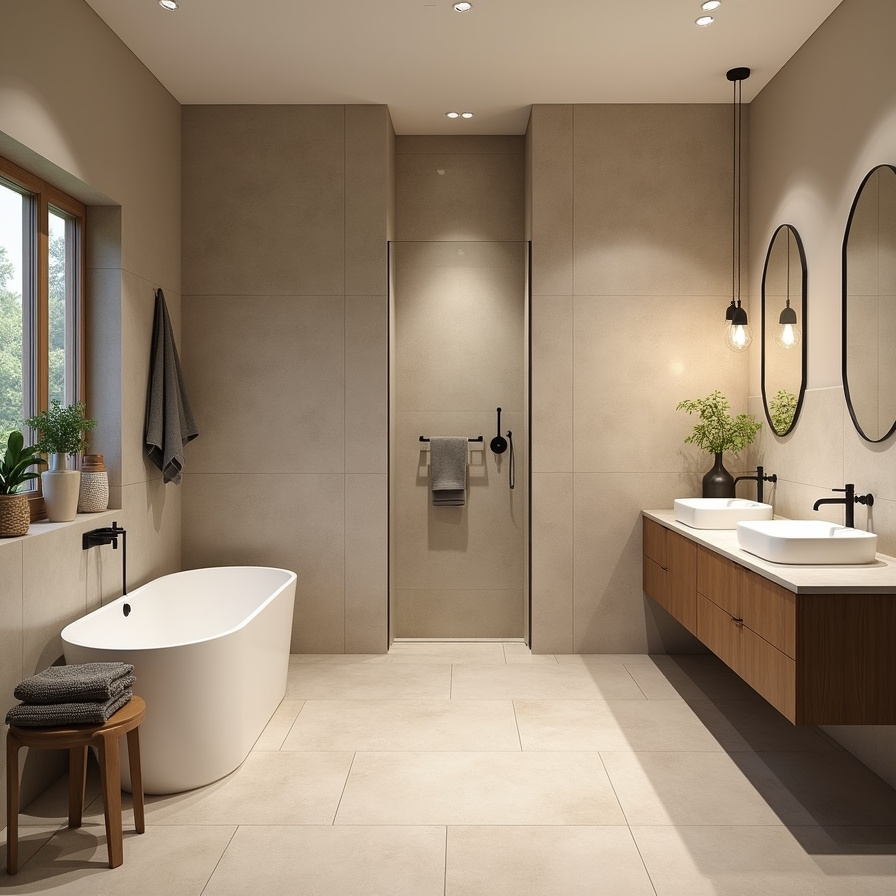 Warm, earthy tones like beige and taupe create a welcoming yet sophisticated bathroom. Using large-format tiles ensures a seamless appearance, while subtle textures prevent the surfaces from feeling flat or sterile. This natural palette works beautifully in homes that combine modern design with organic materials such as wood or stone. Adding greenery enhances the feeling of comfort and connection with nature. By prioritizing calm, cohesive surfaces and muted textures, this style creates a timeless bathroom that remains appealing year after year.
