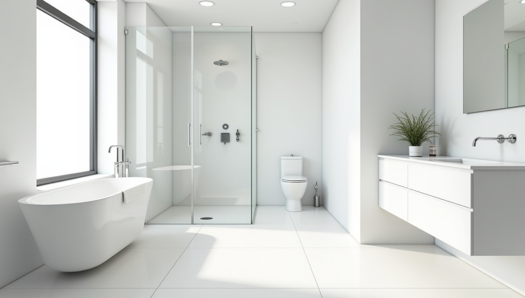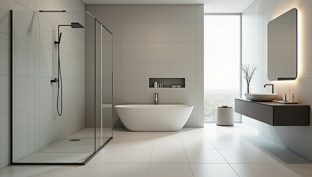 Large white tiles prove that white can be striking rather than plain. Glossy surfaces amplify natural light, making even small bathrooms feel open and airy. Wrapping the same tile across walls and floors creates a continuous, seamless effect. Frameless glass and subtle recessed lighting enhance the feeling of spaciousness. The overall look is clean, timeless, and effortlessly luxurious. By keeping grout lines minimal and letting light do the work, this approach maximizes brightness without overwhelming the senses.
