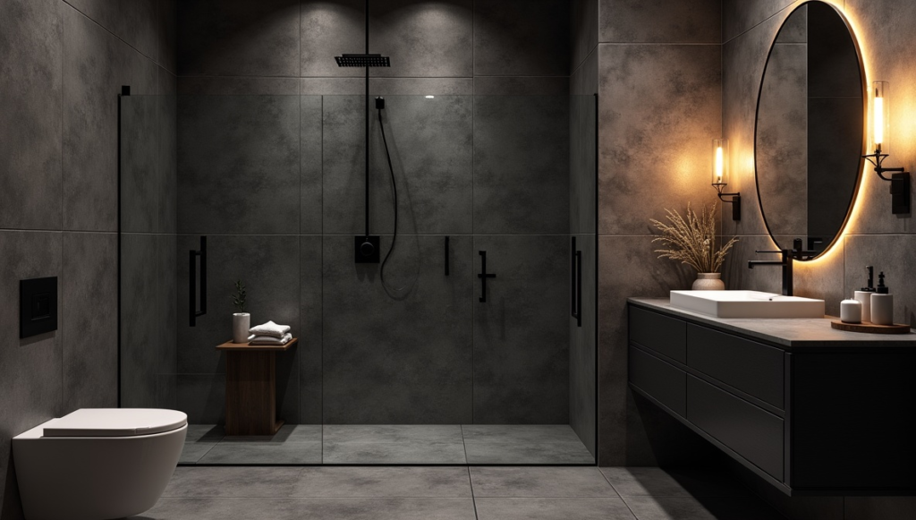 Large, dark stone tiles make a bold statement without feeling heavy. Oversized panels maintain openness, while warm lighting balances the moody tones. Black fixtures integrate seamlessly, highlighting the tiles’ texture and richness. Avoid small tiles, which can make the space feel cluttered or oppressive. This style is perfect for homeowners wanting a sophisticated, luxury-boutique hotel look, combining drama with a sense of intentional design.