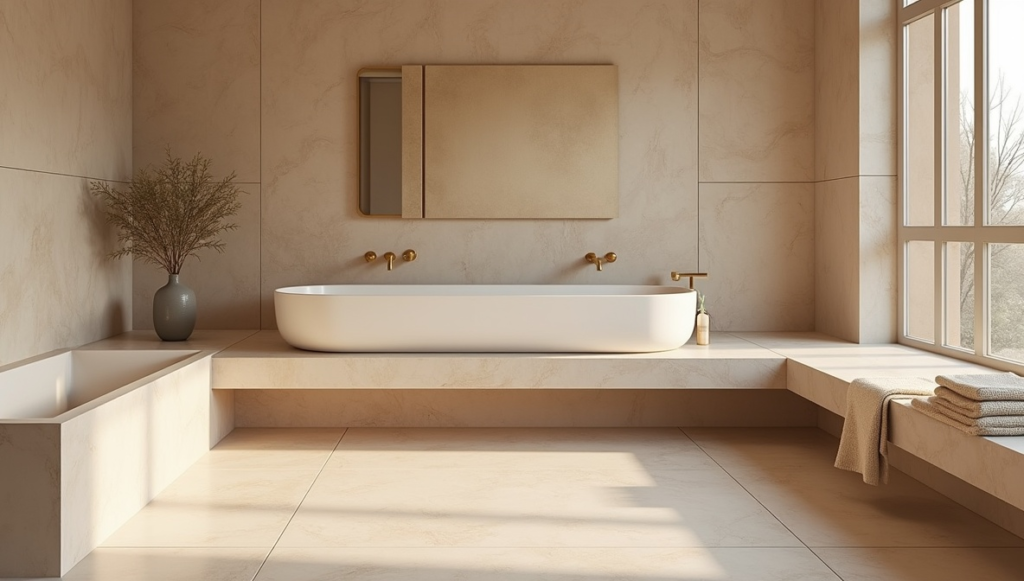 This design evokes the tranquility of a spa. Beige stone tiles create a continuous, calming surface, while natural light brings out the tile’s texture. Minimal interruptions enhance the seamless effect, and adding plants or wood accents introduces warmth and vitality. The result is a spa-inspired bathroom that feels realistic for everyday use—luxurious yet practical. This style shows how continuity and natural textures can turn a daily routine into a rejuvenating experience.