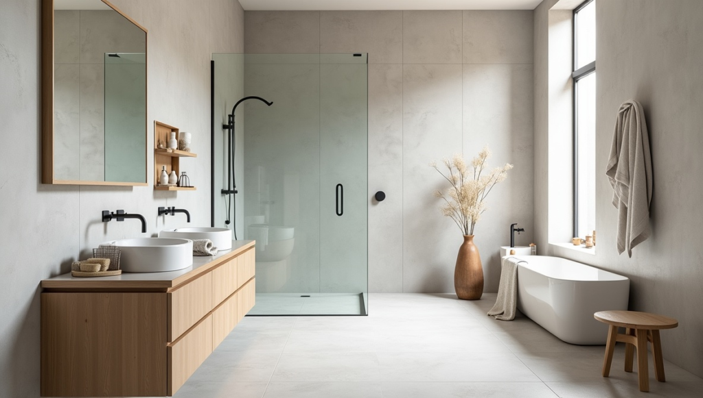 Light gray tiles and natural wood accents create a classic Scandinavian atmosphere. Oversized tiles minimize grout lines, maintaining openness, especially in compact bathrooms. Natural light enhances brightness and highlights the smooth surfaces, keeping the space airy and peaceful. This approach blends minimalism with warmth, making the bathroom feel serene, fresh, and timeless.