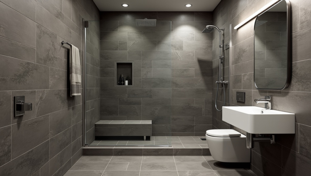 Large slate-look tiles add depth and texture while keeping the shower sleek. Strategic LED lighting highlights the natural patterns, and chrome fixtures enhance the polished look. This style suits urban apartments where bathrooms need character without clutter. The result is a sophisticated, refined aesthetic that elevates everyday routines without feeling overdone.