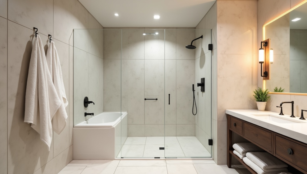 Extra-large matte tiles with linear drains produce modern, precise surfaces. Frameless glass emphasizes the tiles, keeping the focus on clean geometry. Even lighting enhances the matte finish, preventing dullness. Perfect for walk-in showers, this style highlights minimalism and functional design while maximizing visual openness.
