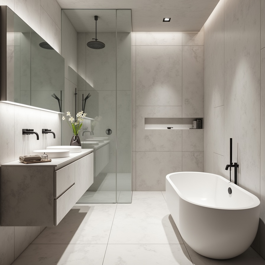 Bold concrete-look porcelain tiles create a striking, architectural atmosphere. Hidden drains and minimal fixtures keep the focus on clean surfaces. Cool neutral tones and strategic lighting give the space a futuristic, polished vibe. This approach is ideal for those embracing fully minimal, ultra-modern designs with a high-impact presence.