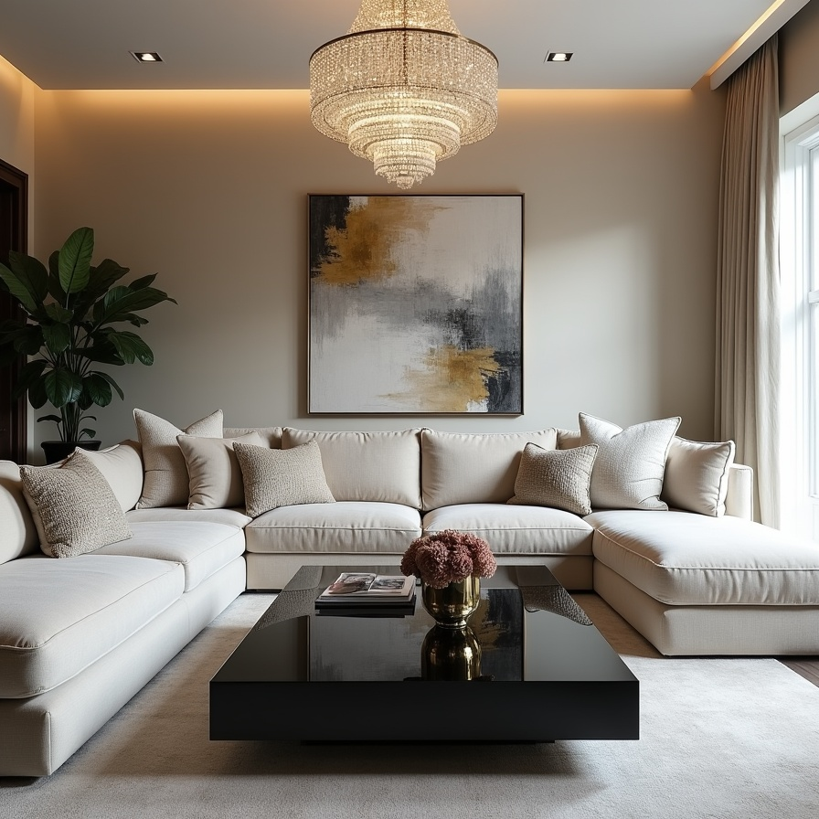 Luxury living room with plush sectional sofa and elegant accents.