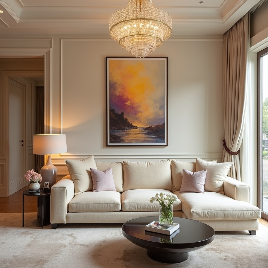 Above, a crystal chandelier scatters light across the room, complementing a bold piece of art that captures attention without overwhelming the senses. Together, these elements blend classic luxury with contemporary flair, creating a space that is both visually captivating and welcoming.
