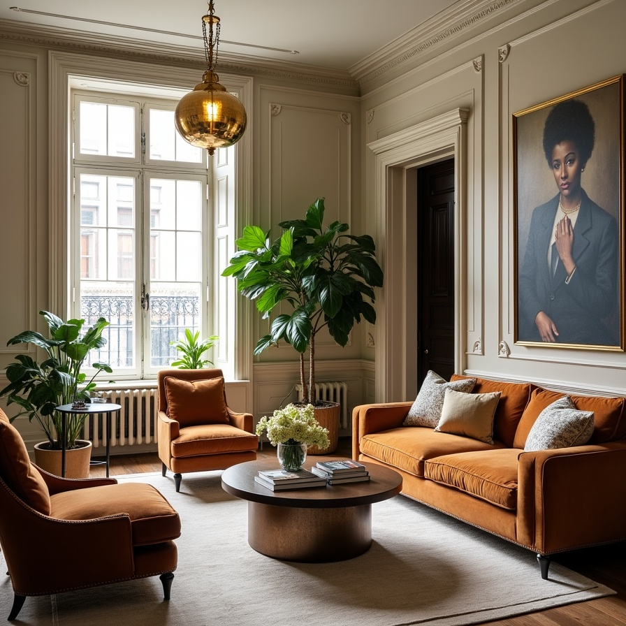 Greenery punctuates the space, offering freshness that balances the sumptuous materials and classic décor. The room exemplifies a sophisticated blend of eras, where vintage grandeur meets modern livability in a harmonious composition.