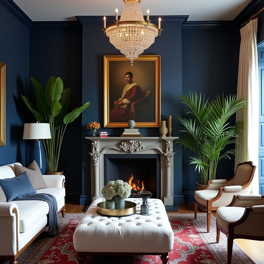 Deep navy walls create a dramatic, stately atmosphere, while a crystal chandelier adds a luminous crown above the space. A gold-framed painting ties the room together, offering a nod to tradition and high-end refinement.
