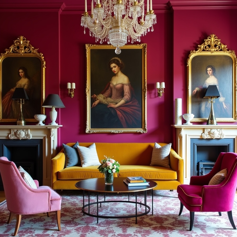 Raspberry-colored walls command attention, creating a rich backdrop that blends Victorian grandeur with modern comfort. A mustard velvet sofa invites relaxation, its opulent hue contrasting beautifully with the surrounding décor.