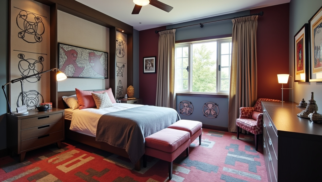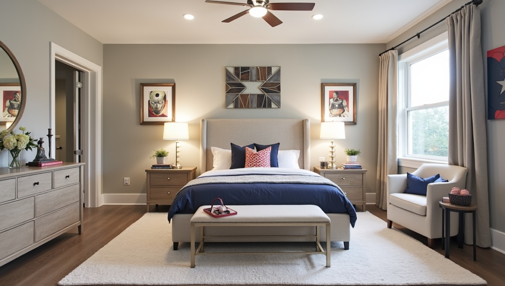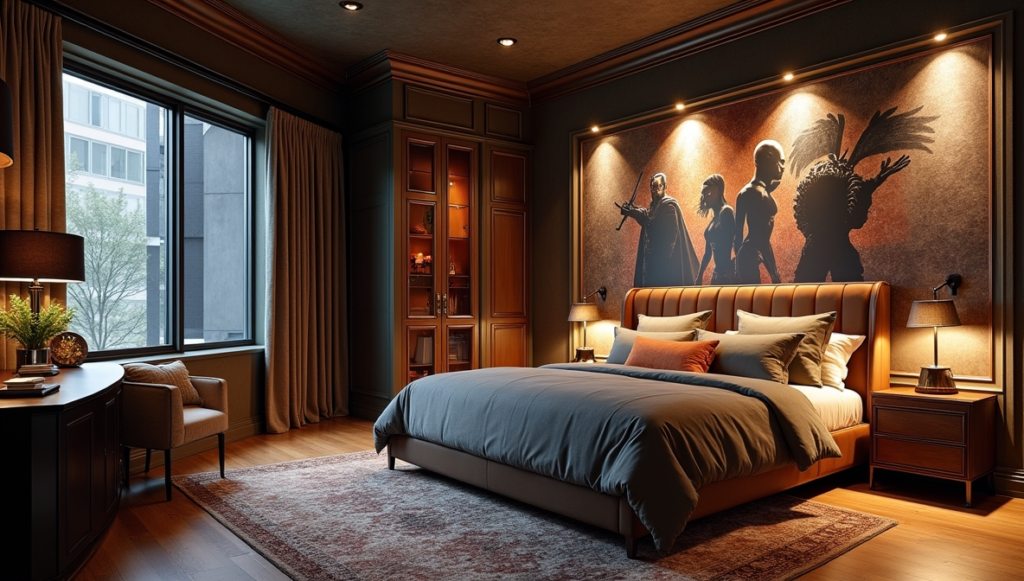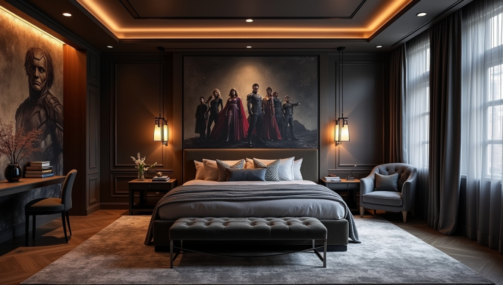 Step into this space and it feels like entering a blockbuster Marvel set. The oversized mural, dramatic lighting, and industrial-inspired textures give it the sense of a secret superhero headquarters. Every corner exudes energy without overwhelming the room’s livability. Thoughtful placement of bedding and furniture keeps the space functional while still feeling bold. This design proves that a striking themed bedroom can be both cinematic and practical, creating a space that excites the imagination while remaining comfortable for everyday living.