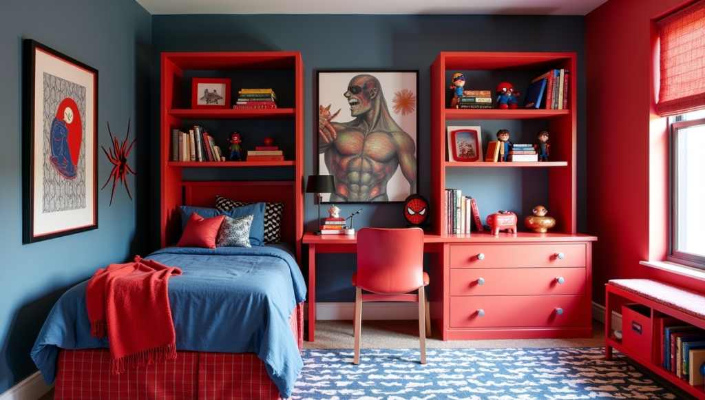This bedroom leans into superhero energy with a showroom-quality aesthetic. Strong colors, coordinated furniture, and cohesive décor convey a bold, confident theme. The space feels polished and dramatic without tipping into chaos, demonstrating how decisive design choices elevate a playful concept. By committing fully to the theme while maintaining visual order, the room achieves balance and impact. It’s a reminder that, sometimes, going all-in is the most effective approach, creating a space that is unmistakably Marvel yet functional for daily living.