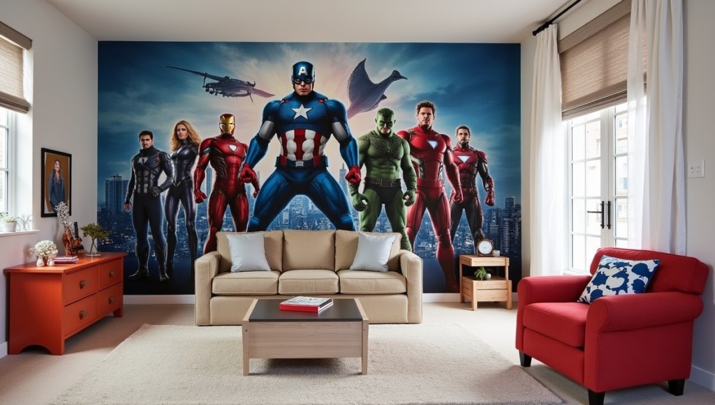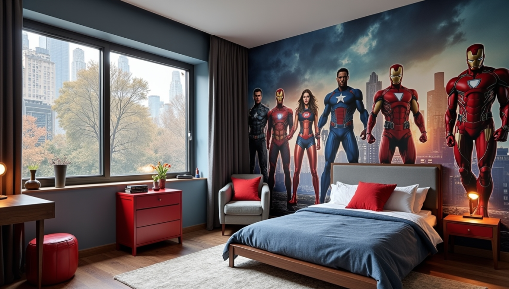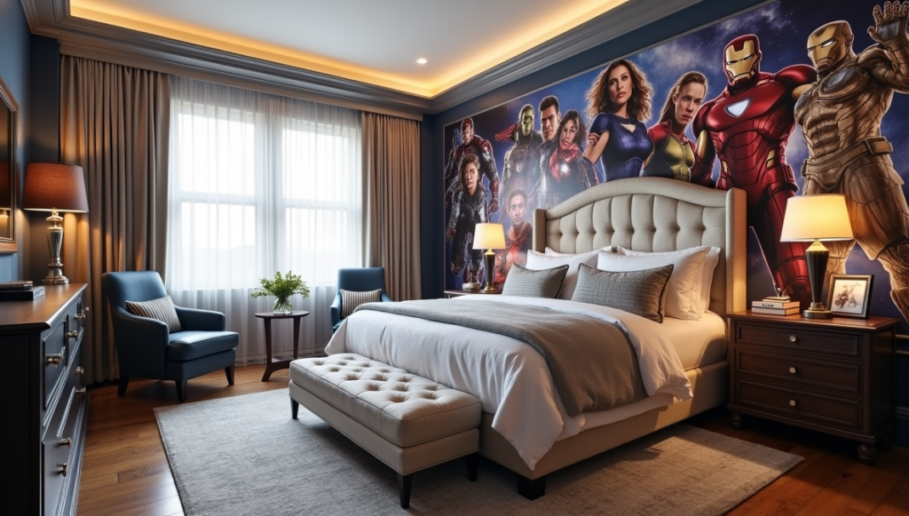This room elevates Marvel décor with a refined, grown-up touch. A hero mural anchors the space, while a plush headboard, soft lighting, and clean lines lend sophistication. The design balances youthful enthusiasm with a polished aesthetic, making it suitable for older children or teens. It shows how superhero style can evolve with age, remaining fun and engaging without feeling juvenile. Every detail, from furniture selection to lighting, enhances both comfort and visual appeal, proving that luxe can meet fandom seamlessly.
