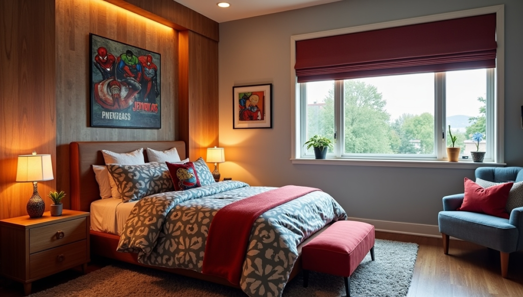 Here, Marvel details are layered with soft textures and plush textiles, creating a warm, lived-in atmosphere. The space feels personal and comfortable, prioritizing everyday comfort alongside character-driven design. Subtle themed touches integrate seamlessly, ensuring the room remains stylish while playful. This combination of function and fandom produces a bedroom that’s inviting and practical. The approach emphasizes that superhero spaces can feel like real homes, blending imagination with comfort, making it an ideal environment for both rest and play.