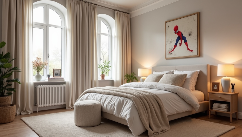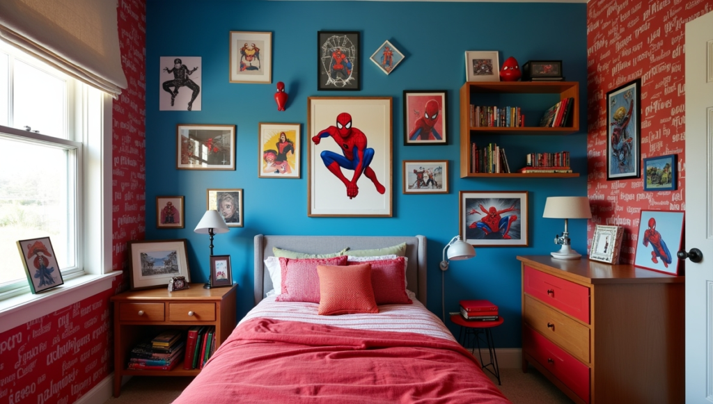 This bedroom treats Marvel as expressive artwork rather than simple décor. Framed hero prints give the room personality while maintaining a calm, gallery-like atmosphere. Subtle wall and furniture choices allow the art to shine, keeping the space serene yet playful. It demonstrates that superhero style can be stylishly understated, proving you don’t need murals or logos in every corner. This approach balances creativity and sophistication, delivering a room that feels personal, visually engaging, and fully functional for everyday life.