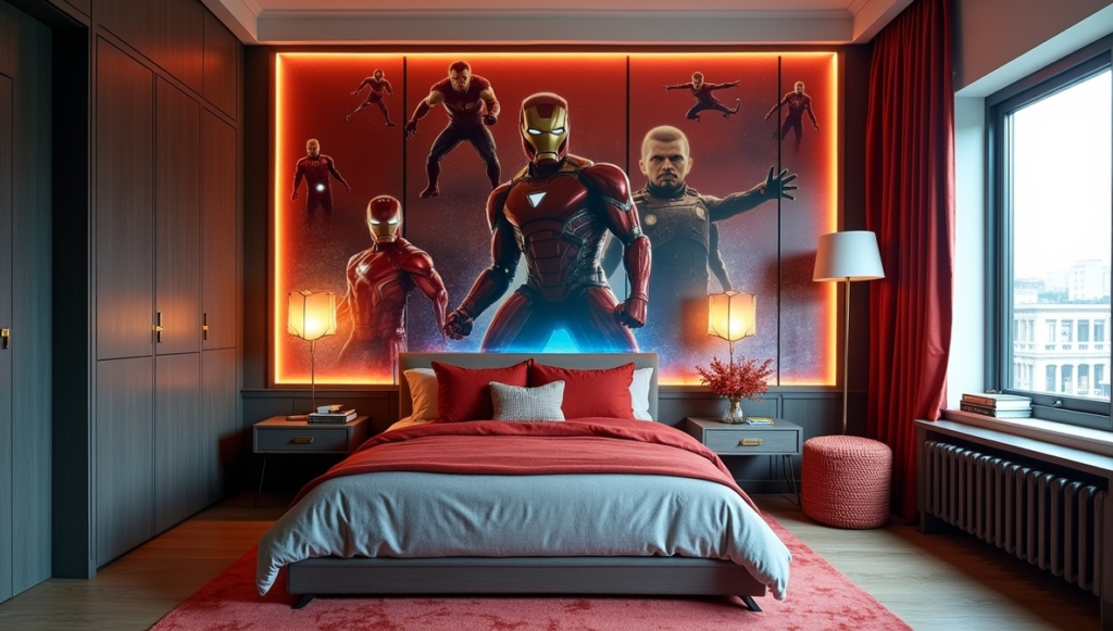 Elevated design meets superhero excitement in this cinematic bedroom. Moody tones, layered lighting, and dramatic murals give the impression of stepping onto a Marvel movie set. The space caters to older fans who want their hero interests reflected with sophistication. Careful furniture and accessory choices keep the room practical while maintaining visual drama. This approach proves that themed rooms can have serious style credibility. By combining cinematic flair with functionality, the bedroom creates a memorable, immersive environment that feels both thrilling and livable.
