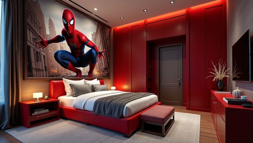 This bedroom goes for cinematic effect with an oversized Spider-Man mural and bold, architectural accents. The red bed frame, moody lighting, and textured walls create the feeling of an urban skyline frozen in action. The room maintains sophistication while delivering superhero excitement, proving themed spaces don’t have to feel juvenile. Every element is carefully placed for drama and usability, creating a space that’s immersive, inspiring, and practical. It’s a Marvel bedroom that feels like a penthouse-level adventure playground.