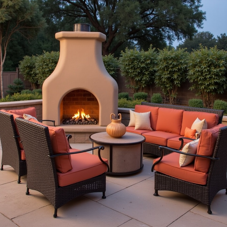 Outdoor fireplaces and chimineas are popular features in Mexican-style patios, especially for evening gatherings. A clay chiminea with a traditional rounded shape creates a cozy focal point while providing warmth during cooler nights. Alternatively, a built-in stucco or adobe-style fireplace can bring a more permanent architectural element to your space. Adding comfortable seating around the fire encourages conversation and relaxation. The gentle glow of the flames makes the patio feel inviting and peaceful. It also turns your outdoor area into a year-round gathering place for family and friends.