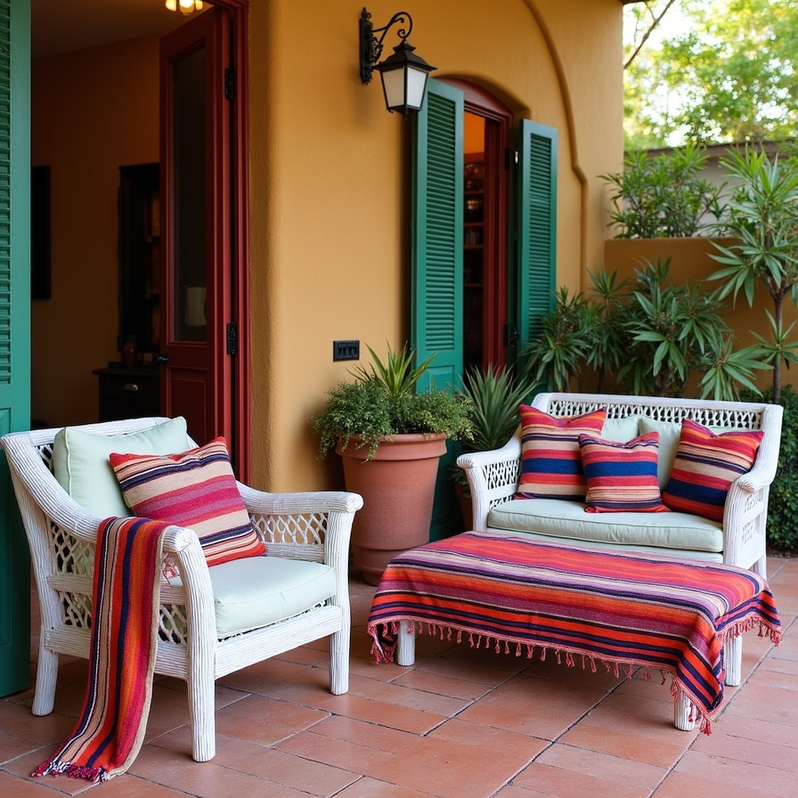 Mexican textiles are known for their bold patterns and lively colors, and serape blankets are a great example. These striped fabrics can be used in many ways to enhance your patio décor. Try placing them over benches, chairs, or outdoor sofas to add softness and visual interest. They also work well as picnic blankets or decorative table covers. The combination of bright colors and woven textures brings warmth and personality to your space. Using textiles in layers can make the patio feel comfortable and vibrant while celebrating traditional Mexican design elements.