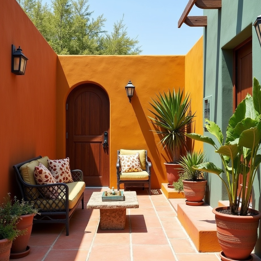 Color plays an important role in Mexican design, and outdoor walls are often painted in rich, sun-inspired shades. Warm colors such as terracotta, burnt orange, mustard yellow, or deep turquoise can instantly change the mood of your patio. If your space includes a fence, stucco wall, or garden wall, painting it in a bold color creates a beautiful backdrop for plants and décor. These colors reflect sunlight well and give the patio a welcoming, cheerful feeling. A vibrant wall can also make greenery and decorative elements stand out more dramatically.