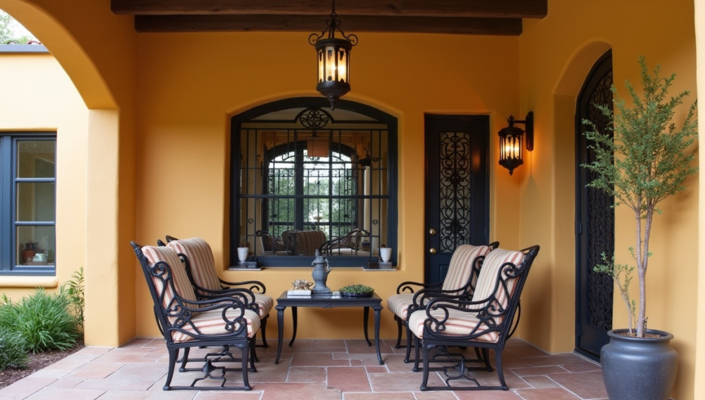 Wrought iron is commonly used in Mexican architecture and adds strength and elegance to patio designs. Decorative iron elements can appear in furniture, gates, railings, lantern holders, or wall decorations. The dark finish of iron contrasts nicely with colorful tiles and painted walls. Curved shapes and scroll patterns are especially common in traditional designs. Even small touches like iron candle holders or window grilles can enhance the overall look of your patio. These durable pieces also withstand outdoor conditions while maintaining their classic appearance.