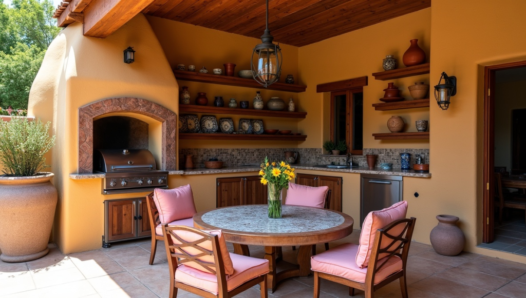 An outdoor kitchen allows you to cook and entertain while enjoying fresh air. A Mexican-inspired version may include tiled countertops, built-in grills, clay ovens, and open shelving for dishes and cooking tools. Decorative tiles can add color and personality to the cooking area. Clay bowls, traditional stone mortars, and handmade serving dishes can also enhance the theme. With comfortable seating nearby, guests can gather while meals are prepared. This type of setup encourages social dining and makes outdoor gatherings feel festive and welcoming.