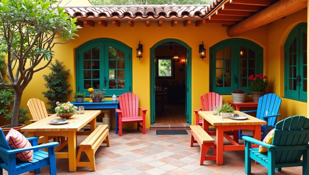 Colorful furniture is a signature element in many Mexican patios. Chairs, benches, and tables are often painted in vibrant shades such as blue, red, green, or yellow. Mixing different colors creates a cheerful and lively environment. Wooden furniture works especially well because it holds paint beautifully and can be easily refreshed when needed. Adding colorful cushions or patterned pillows can enhance comfort while tying the color palette together. Bright furniture pieces bring personality and energy to the patio while maintaining a welcoming and relaxed vibe.