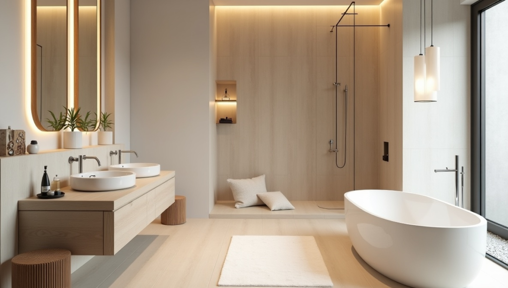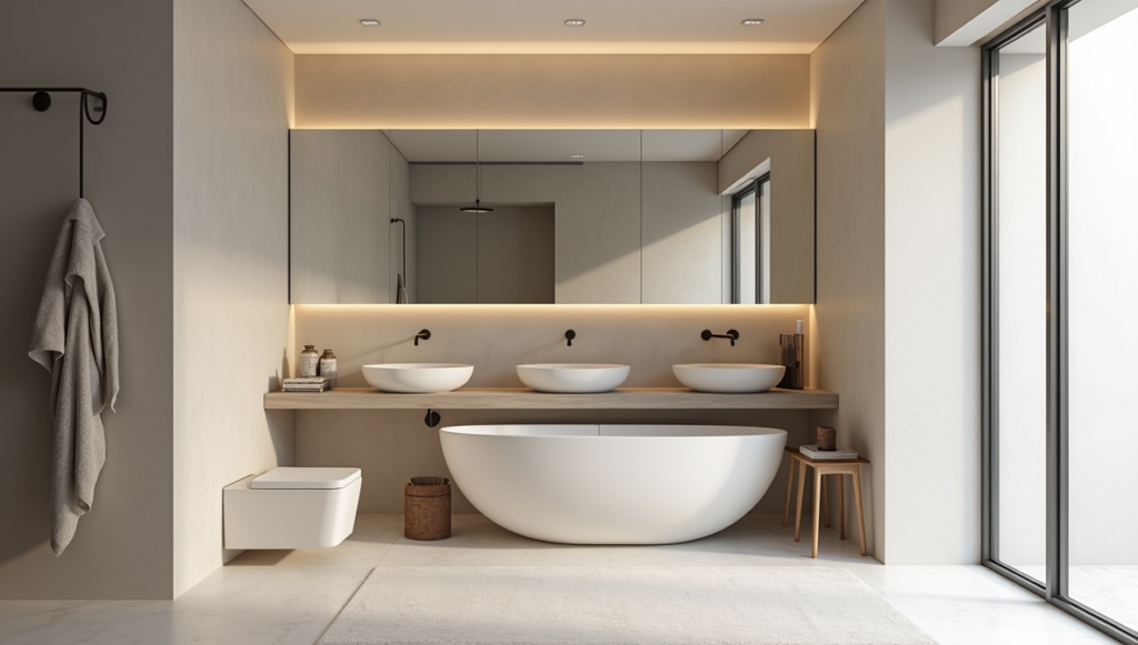 Serene minimalist bathrooms focus on harmony, soft lighting, and uncluttered layouts to foster relaxation. Neutral palettes, natural materials, and simple fixtures create a calm, peaceful environment. Every design element is purposeful, enhancing both comfort and aesthetics. Thoughtful placement of mirrors and lighting adds depth without visual clutter. Serene bathrooms provide a restorative experience, making daily routines more enjoyable. This style is perfect for homeowners who value tranquility, creating a space that feels balanced, inviting, and visually gentle while maintaining the clean, minimalist principles that ensure long-term appeal.